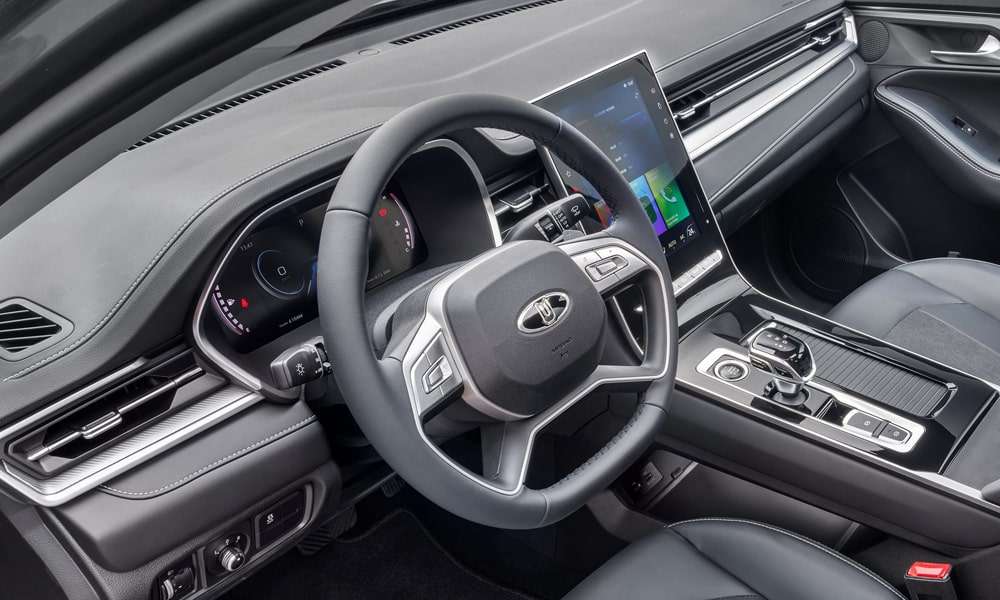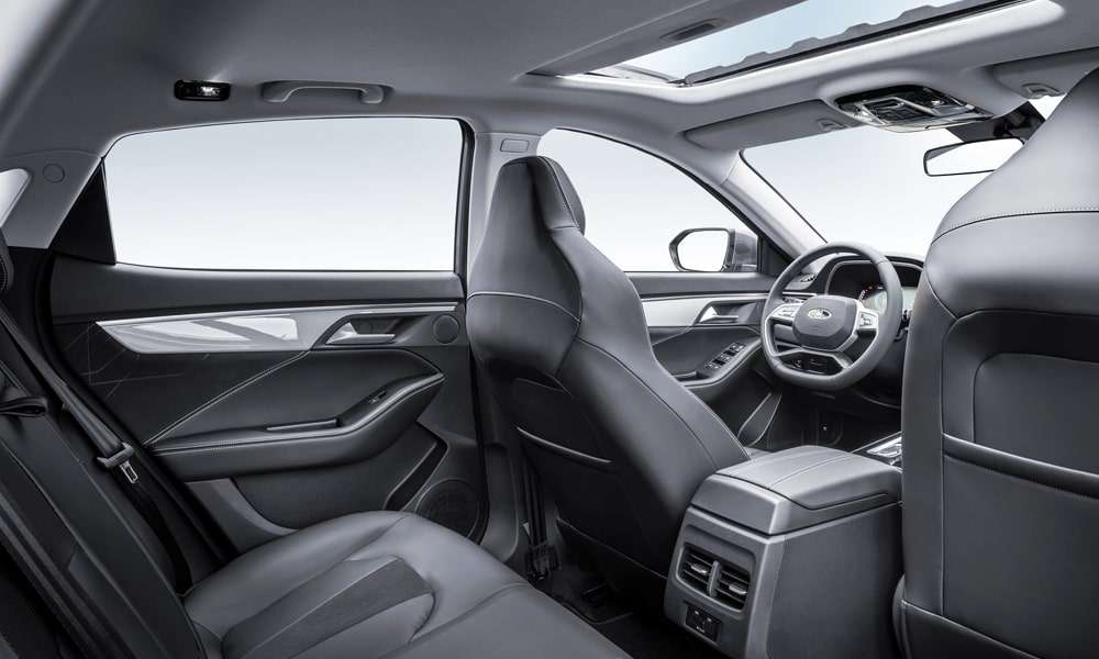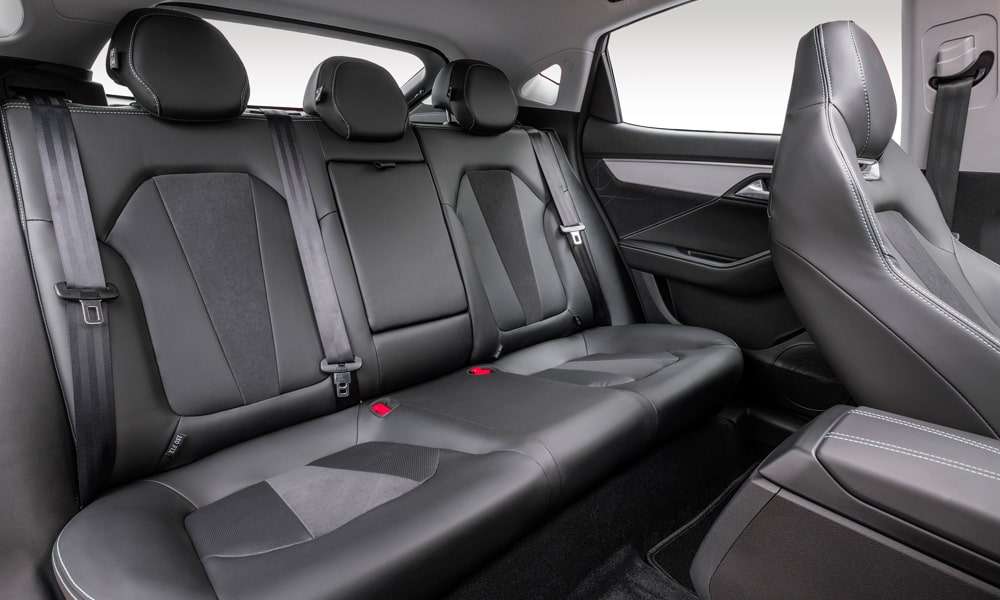 Кожаная отделка сидений черного цвета с декоративной прострочкой, перфорацией и декоративными вставками